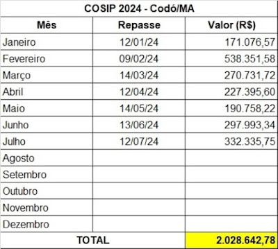 Conforme apurado pelo Blog do Graciliano, no dia 13.julho.2024, a Prefeitura de Codó recebeu o montante de R$ 332.335,75 referente ao repasse da Contribuição de Custeio da Iluminação Pública (COSIP). Todos os dados foram obtidos no Portal da Transparência do município.