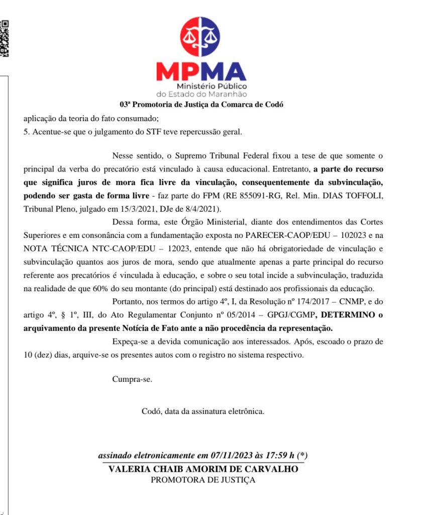A promotora que responde pela área da Educação na Comarca de Codó decidiu mandar arquivar a representação que pedia providência baseando-se no argumento jurídico que diz que se o dinheiro não for mais do valor principal, ou seja, pertencer aos juros e mora do que se tinha em depósito inicialmente, ele pode ser gasto de forma livre.