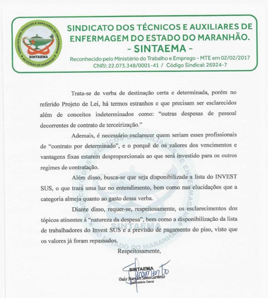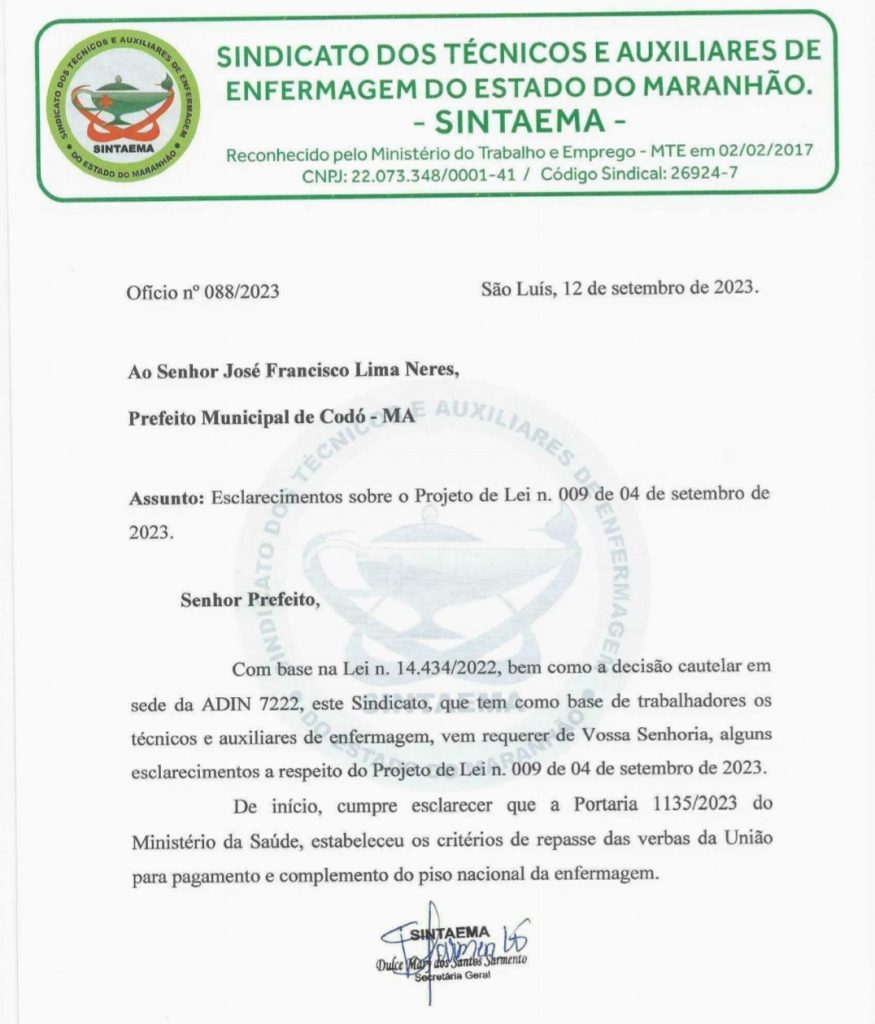 O SINDICATO DOS TÉCNICOS E AUXILIARES DE ENFERMAGEM DO ESTADO DO MARANHÃO enviou ofício ao prefeito de Codó Dr. Zé Francisco.