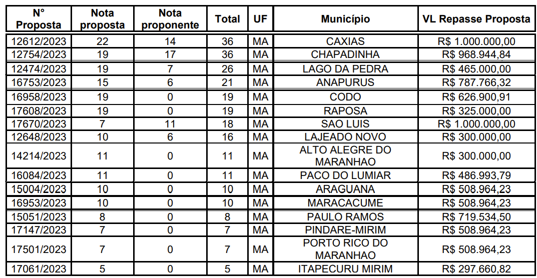 No Maranhão, foram 16 municípios pré-selecionados que juntos receberão R$ 8,8 milhões conforme divisão da planilha acima: Caxias, Chapadinha, Lago da Pedra, Anapurus, Codó, Raposa, São Luís, Lajeado Novo, Alto Alegre do Maranhão, Paço do Lumiar, Araguanã, Maracaçumé, Paulo Ramos, Pindaré-Mirim, Porto Rico e Itapecuru.