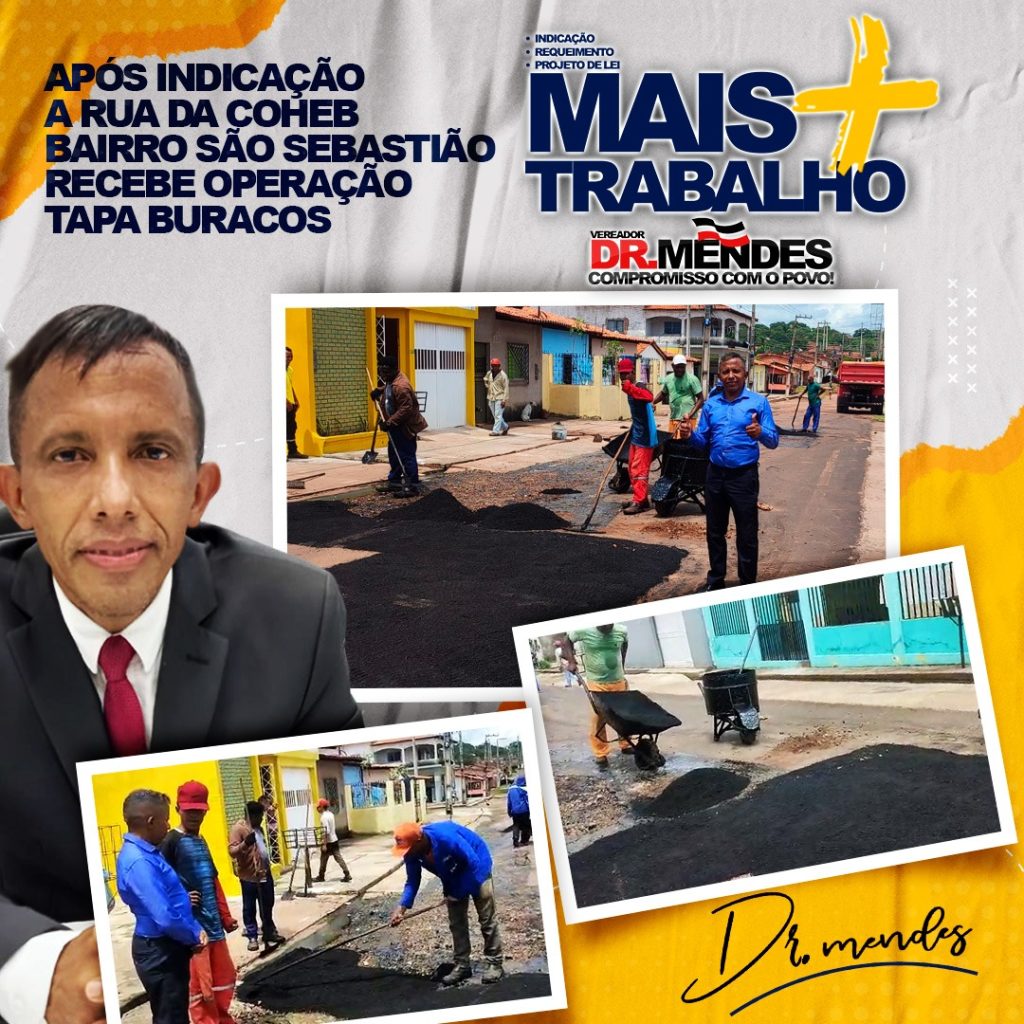 Vereador Dr. Mendes Fiscaliza Obras No Bairro São SebastiãoO Vereador Dr. José Mendes esteve na Rua da Coheb, bairro São Sebastião, para visitar as obras da operação tapa buracos.