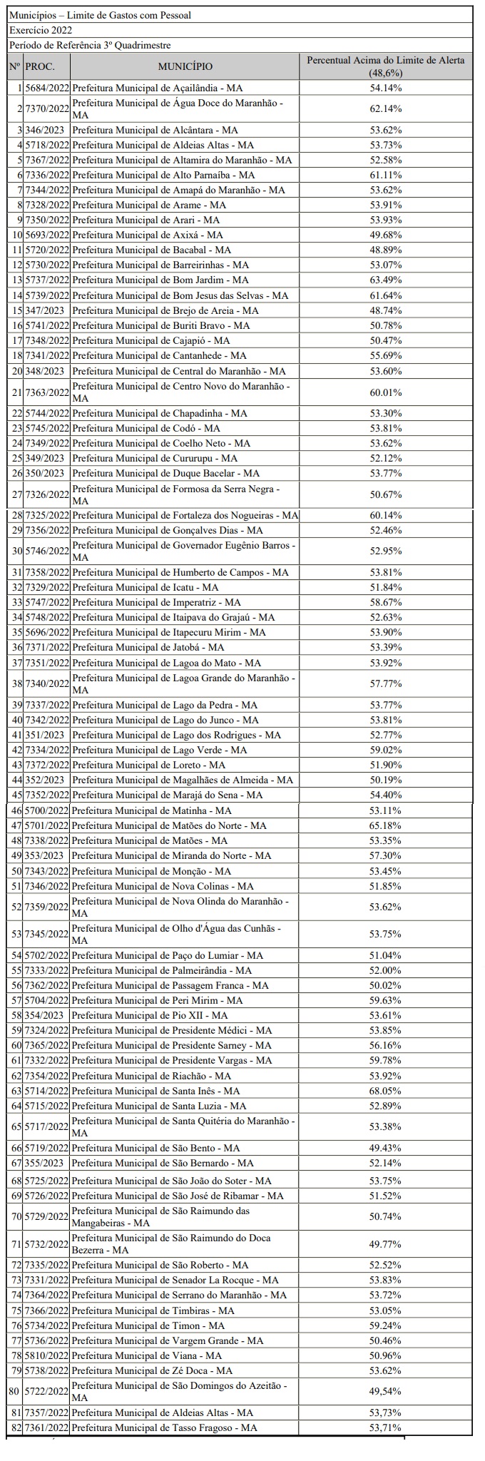 as 82 prefeituras flagradas pelo TCE-MA em distorções em questão diz respeito aos limites de gastos com pessoal no exercício de 2022. Abaixo a relação: