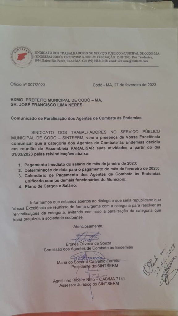 Ontem, segunda-feira, 27, eles se reuniram novamente  na sede do SINTSERM e depois foram à prefeitura de Codó onde obtiveram a marcação de uma reunião com o prefeito Dr. Zé Francisco, do PSD.
