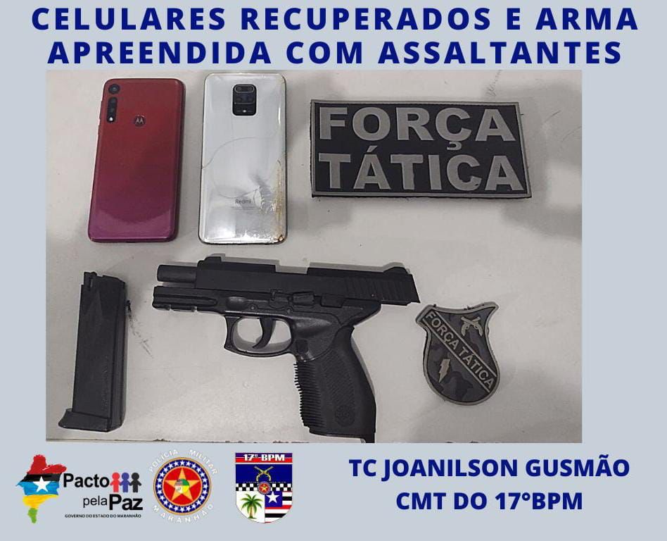 durante a realização de rondas no Centro da cidade de Codó-MA, a guarnição da Força Tática foi acionada para atender uma denúncia de roubo a pessoa, onde dois homens armados teriam tomado de assalto dois celulares das vítimas.