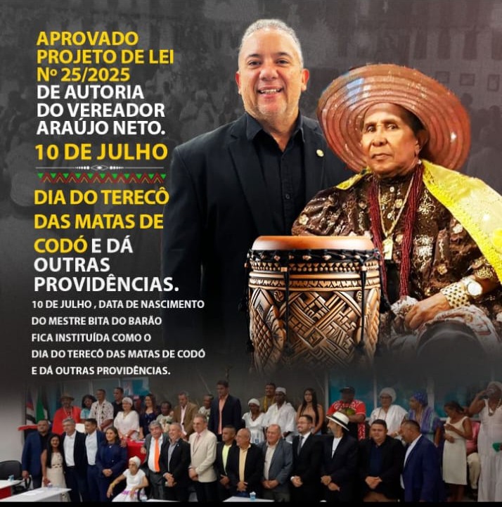 Na última terça-feira (18), durante a 37ª Sessão Ordinária da Câmara Municipal de Codó, foi aprovado o Projeto de Lei nº 25/2025, de autoria do vereador Araújo Neto, que institui oficialmente o Dia Municipal do Terecô Tambor das Matas de Codó, que será celebrado anualmente no dia 10 de julho, data de nascimento do Mestre Bita do Barão, uma das maiores referências da cultura tradicional e religiosa do país.