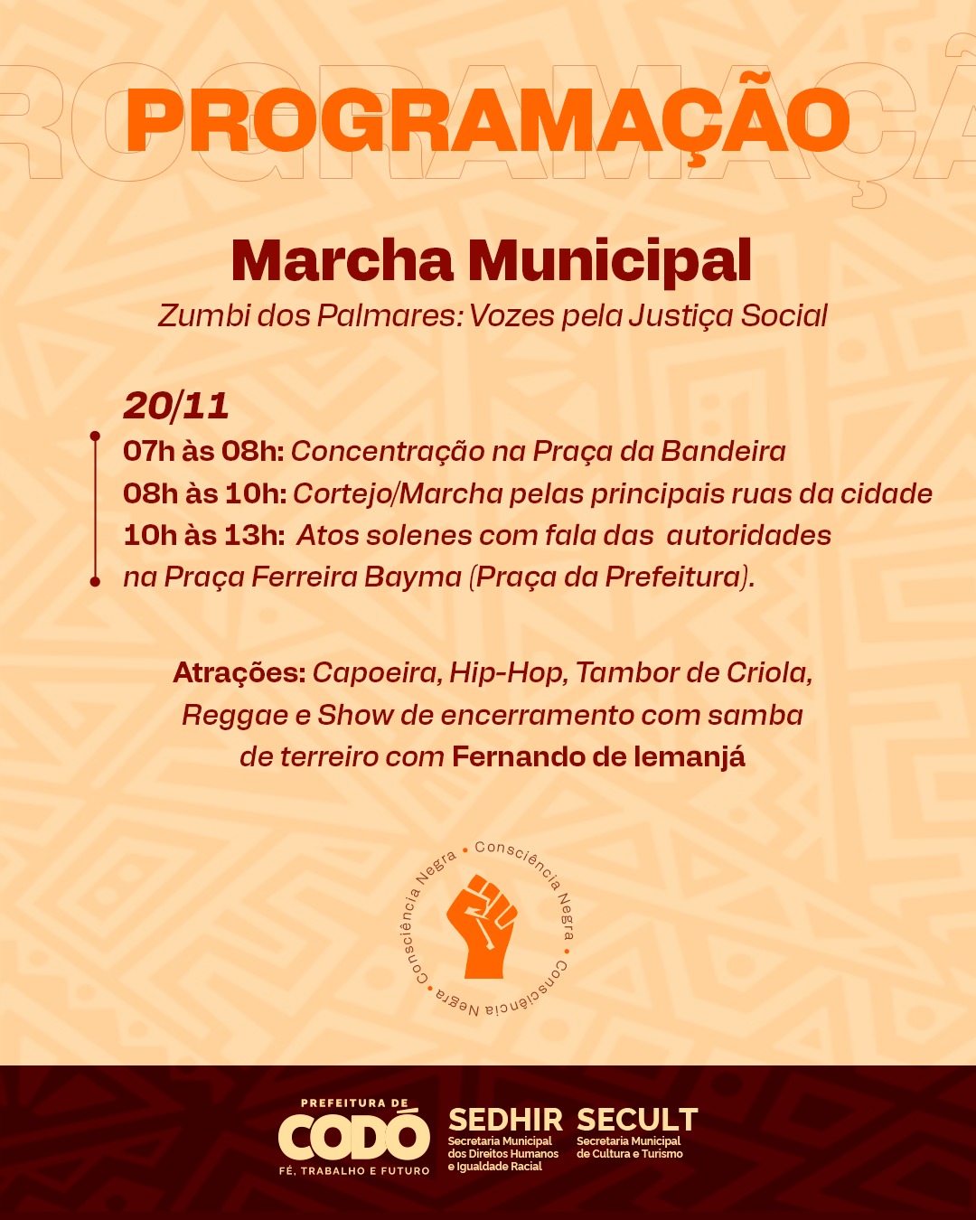 A programação terá início às 7h, com concentração na Praça da Bandeira, seguida de um cortejo pelas ruas da cidade. Durante todo o percurso e no encerramento, o público poderá prestigiar diversas manifestações culturais que representam a força e a ancestralidade do povo negro, como capoeira, hip hop, tambor de crioula, reggae e um grande show de samba de terreiro com Fernando de Iemanjá.