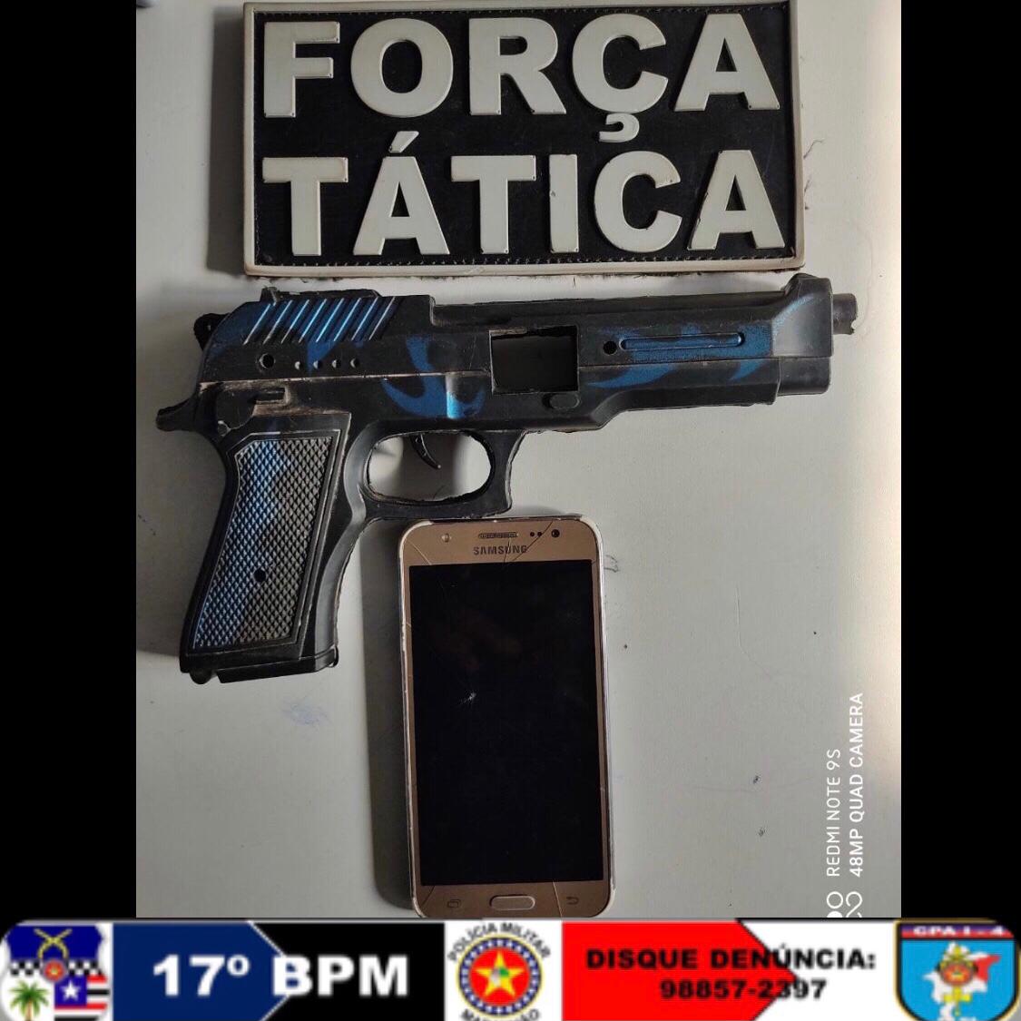 De pronto, a guarnição dirigiu-se até o endereço indicado pela vítima. Chegando ao local, o suspeito foi localizado mas inicialmente negou a autoria do roubo; entretanto, ao ser reconhecido pela vítima e por alguns vizinhos da mesma, acabou assumindo a autoria do crime e informou também o local onde havia deixado o simulacro e o celular .