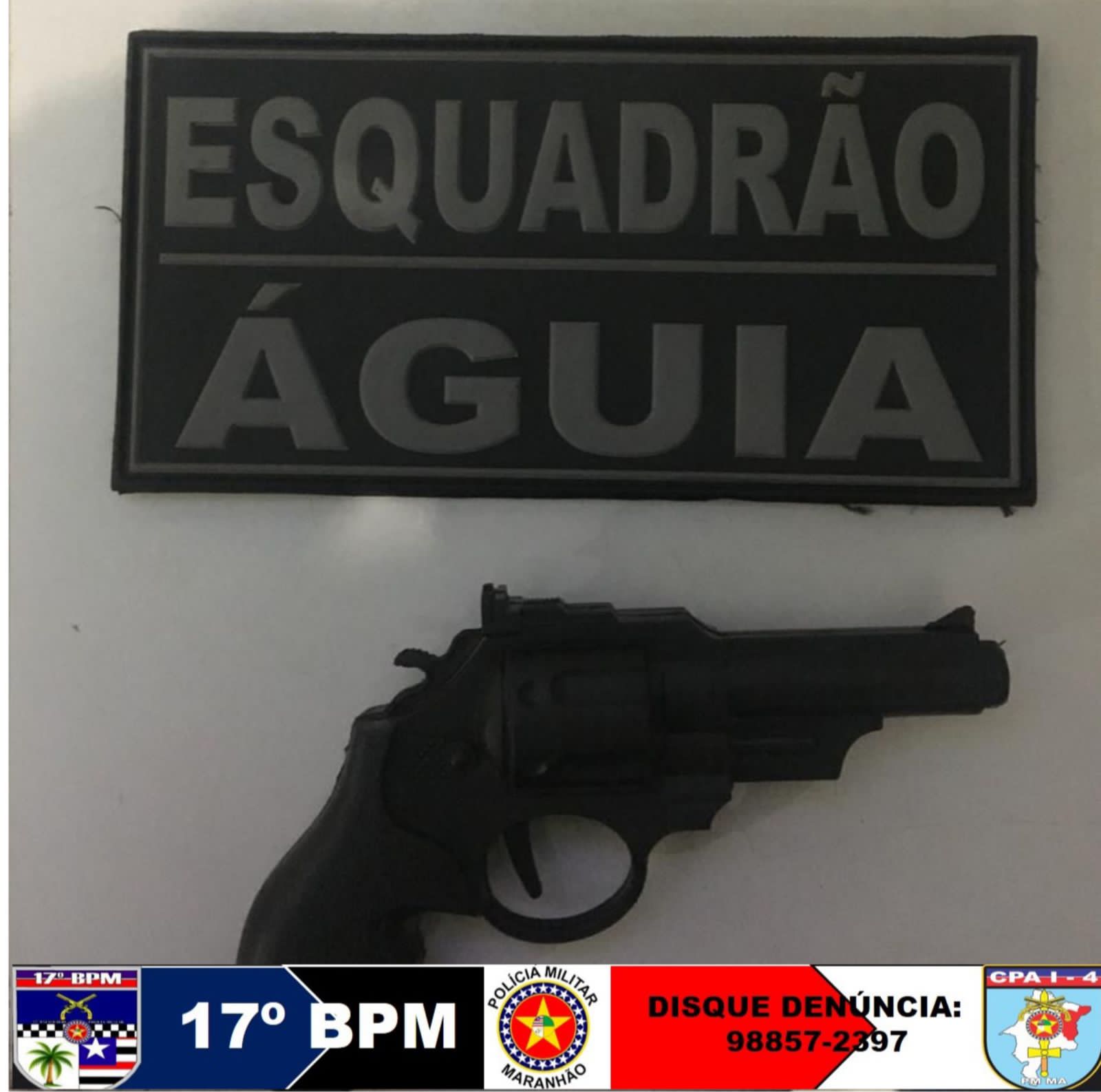 O suspeito foi localizado em seguida , os militares realizaram a abordagem e revista pessoal e localizaram um simulacro de arma de fogo tipo revólver.
