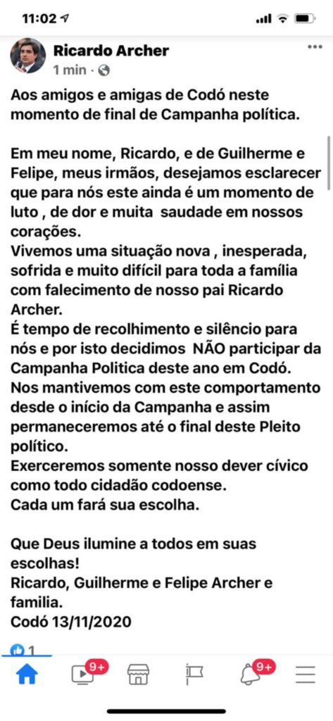 Usando sua conta no Facebook o empresário Ricardinho Archer repreendeu o uso da imagem do pai dele, Ricardo Archer, em campanha política. O ex-prefeito faleceu vítima de Covid-19 em 29 de julho de 2020.