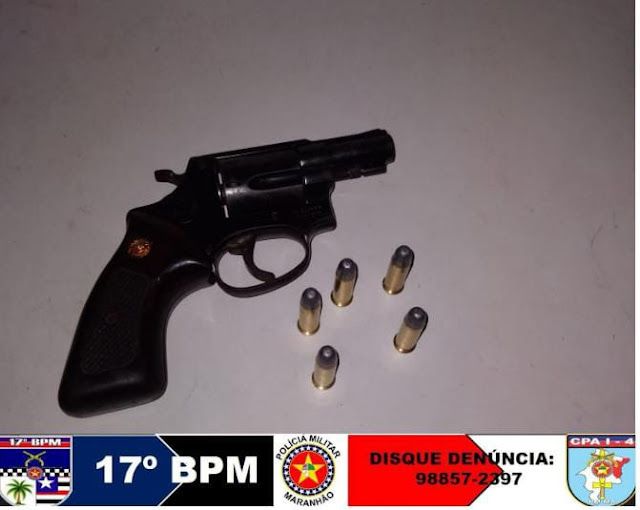 Durante a abordagem foi encontrada uma arma de fogo, revólver cal. 38, marca Taurus, municiada com 5 munições intactas, momento este que foi dado voz de prisão e conduzido o mesmo à Delegacia de Policia Civil sem lesões corporais, para que sejam tomadas as medidas legais cabíveis.
